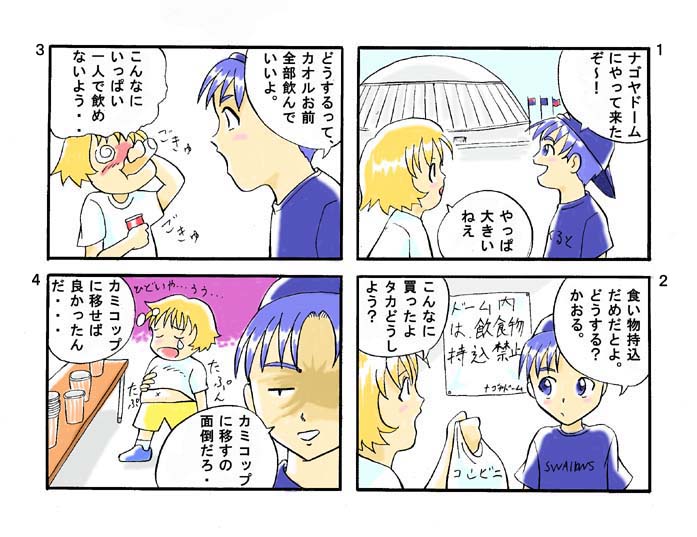 ともだち君 このまんがは、ひろふみが書き下ろした 4コマまんがです。2人の少年が登場します。 タカはちょっぴり意地悪で、カオルは、のほ ほんとしています。一見タカの意地悪さが目に つきますが、それはきっとカオル君への愛情 の裏返しなのだと思います。 四コマを初めて描いた感想は、「もう二度と 描くかっ!!」って感じです。書く気になったら 続編描くかもしんない・・。 ちなみに作者の意向でスワローズファンと なってます。(笑) |