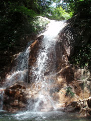 休憩していると、キイロスズメバチがまとわり付いてきました。近くに巣があるのだろうと思っていたら、滝(下の画像)の手前、左岸の壁に巣がありました。 |