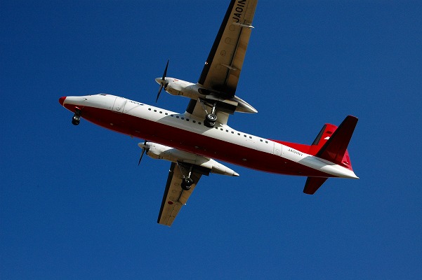 着陸体勢の小型ジェットプロペラ機、 プロペラが止まって見えるので、不思議に