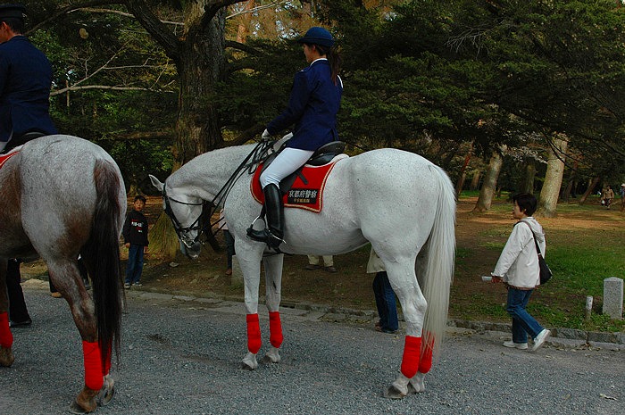 京都府警察の白馬、騎手は可愛い女性!! 御所の警備で巡回しているのでしょうか? とにかくこのような姿、めったにお目にかかれないそうです(*^o^*)