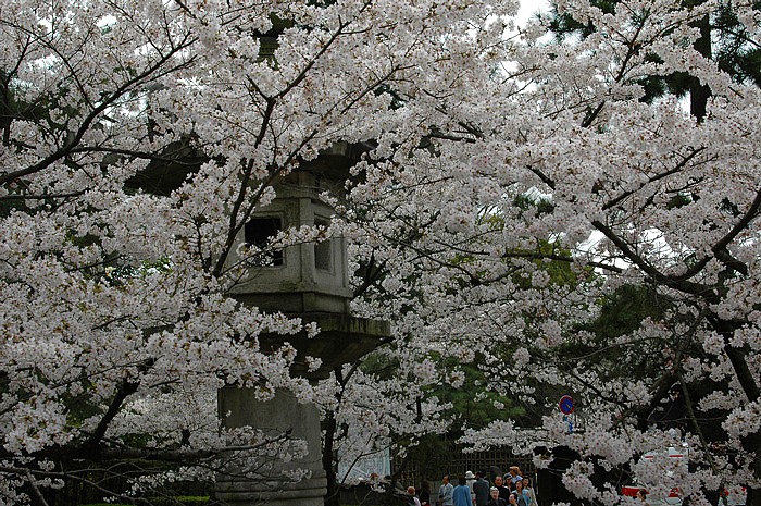 山門横にある灯篭、桜の間からほんのりと見える灯篭が風流である