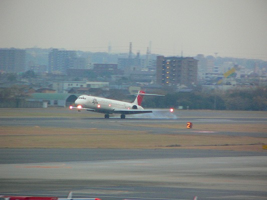 夕暮れ時、JAL機が着地した瞬間である! 車輪と地面の摩擦による煙を