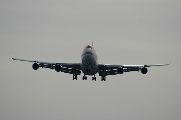 ぐんぐんこちらに迫ってくる ジャンボ機、 さすが大きいなーーあ! こんな角度からは、なかなか見られない。 滑走路から1〜2Km手前でしょうか? 夕暮れ時のためライトもはっきりと見える。