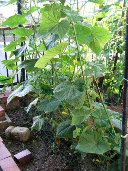 きゅうりです。実がよく見えて採りやすいように、今年はネットをはり垂直に這わせるようにしました。