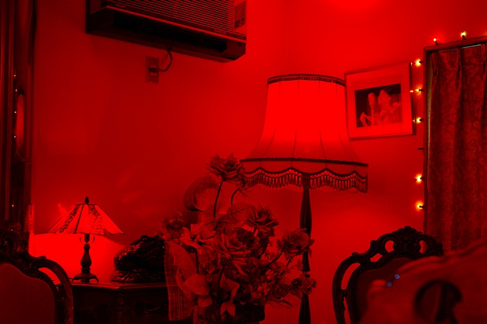 燃えるような赤い照明が、歌い手をムードに誘う!!