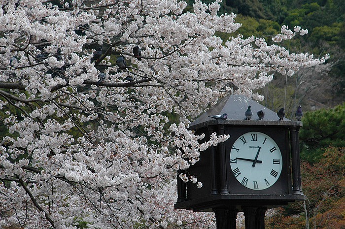 公園内の時計台・ 桜とのバランスも良いが、時計台に止まっている鳩も面白い!!