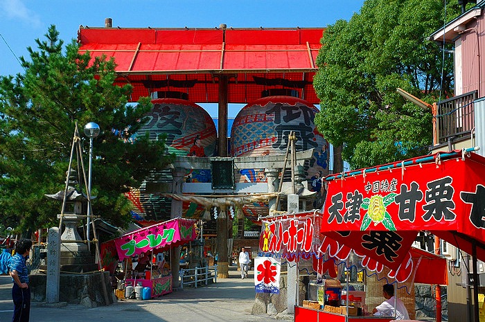 早朝の門前 まだ人影は少ないが、屋台も準備にかかり祭りの雰囲気だ!!