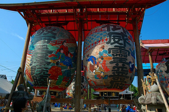 提灯の大きさは最大で高さ10m、直径5.6mもある。各町内が2張りづつ所有して いるので、6町内全部で12張りの大提灯が奉られる。 やぐらの組み立て、提灯の 設置、そしてそれらの撤去は、全て町内の人が人力で行う大変な作業である。