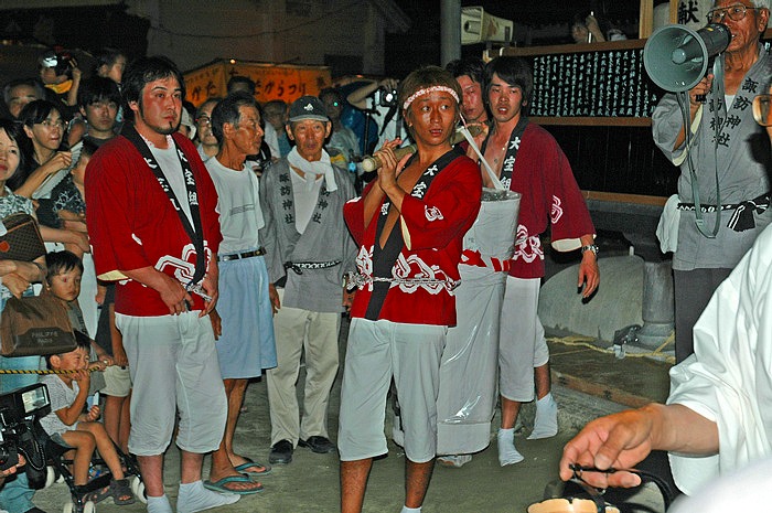 本堂から巨大ろうそくを担ぎ出すところである。この祭りの一大行事の