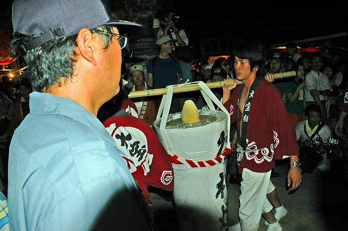 巨大ろうそくを大提灯のところまで運ぶ途中である。