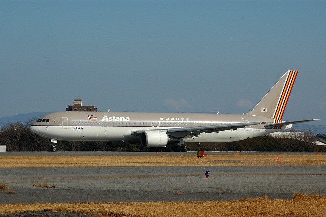 着地寸前の Asiana航空機、背景とマッチして美しい!!