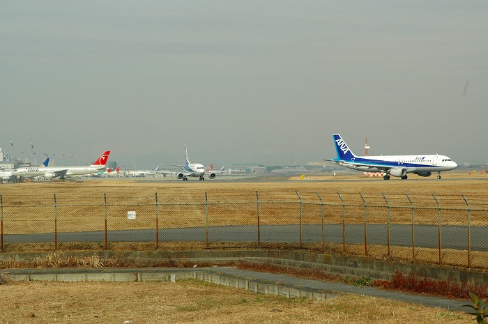 空港南方より滑走路方面を望む、中央と右側にはメイン滑走路に向かっている 全日空の航空機が見える、時間帯によってはかなり離陸ラッシュである。