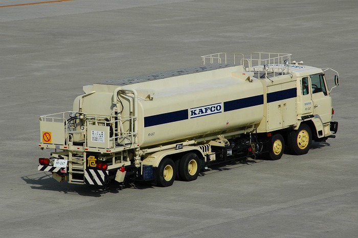 航空機のジェット燃料を運ぶタンクローリ、 後部の名盤の文字が読み取れないのが