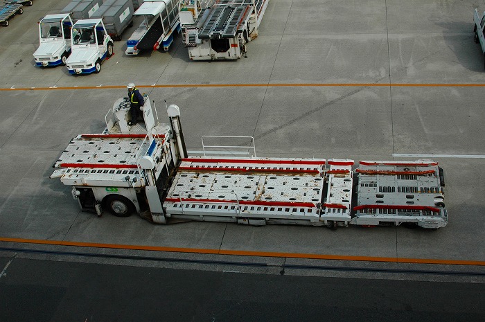 航空機からコンテナを運び出すキャリアカー、自力走行できるんですね!!