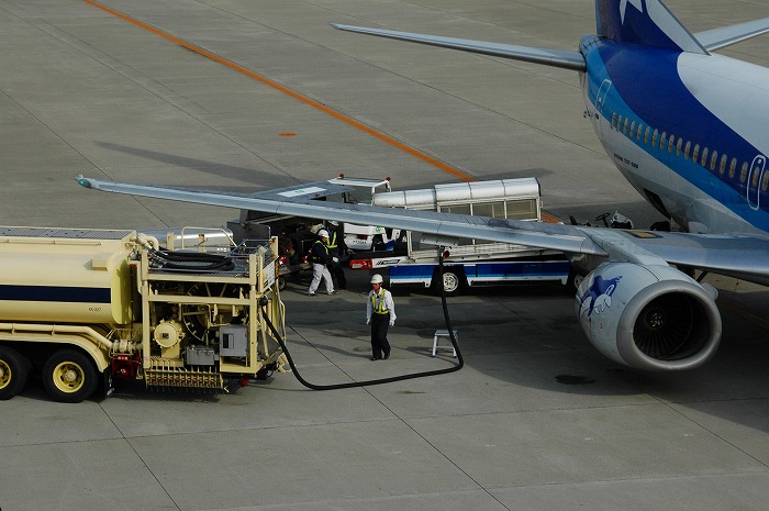 全日空機に給油中! タンクローリの後部に専用ポンプをドッキングさせて
