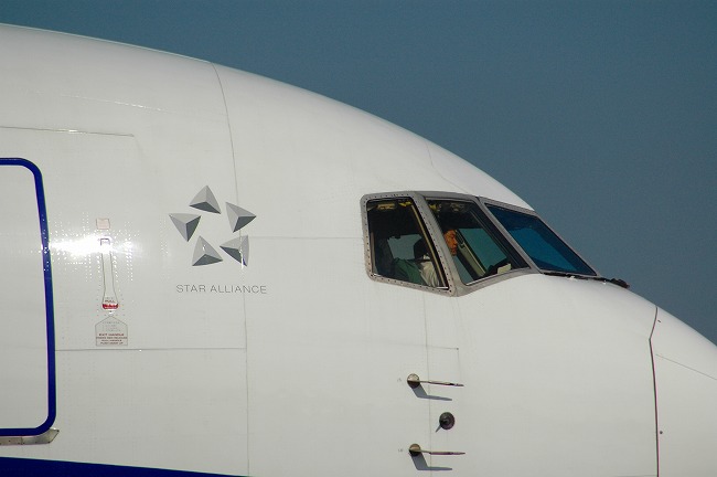 メイン滑走路に向かう途中の全日空機の操縦席、パイロットの姿を捉えるには