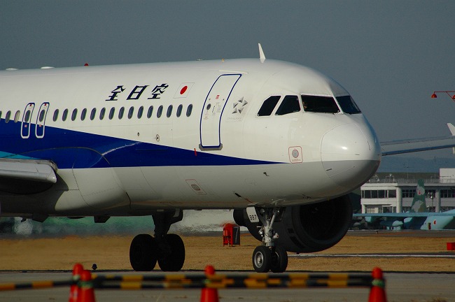 ゆっくりとメイン滑走路に向かう全日空機、低速走行でもジェット音はすごい!