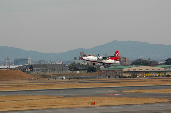 メイン滑走路から離陸し上昇を開始した小型ジェットプロペラ機、 プロペラが 止まって見えるので、不思議に感じるがシャッタースピードが1/5000と早いか らである。 後方に見えるのは航空自衛隊小牧基地の建物である。