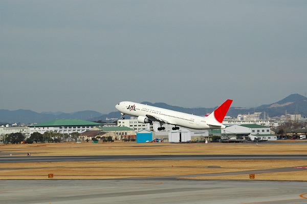 メイン滑走路から離陸し上昇を開始したJAL航空機を送迎デッキから捕らえた。