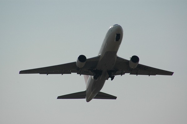 滑走路から離陸し上昇を開始した機体を下から仰いで捕らえたが、着陸と 違い、離陸の場合は撮影ポイントに恵まれないため、残念ながら迫力ある 写真は撮れなかった。 よく見ると車輪を格納中であるのがわかる。 エンジン全開! すごい轟音!!