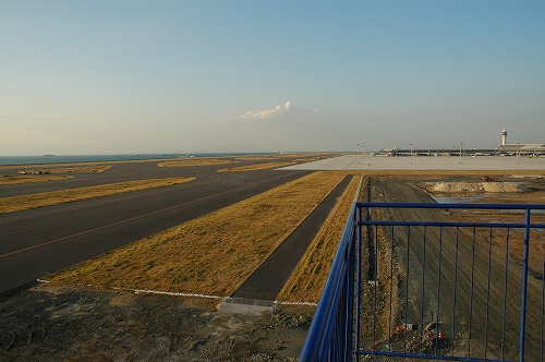 未完成の滑走路、広いなーーあ! 右方には建物と管制塔が見える。