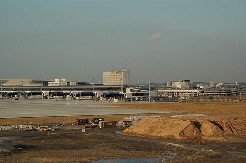 外観はほぼ完成したかに見える空港本体の建物と後方に見えるホテルである。 手前はまだまだ工事中の滑走路。 空港は内装や設備、電気工事などが特殊なため、これからの作業のほうが 大変のようである。