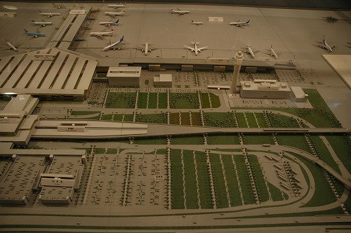 中央右にコントロールタワーが見える、上部は国内線駐機場、下方は駐車場。