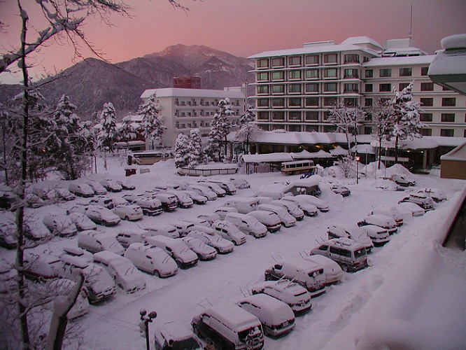 ホテル4階ロービーより駐車場を望む、左手の山の向こうがピンク色に
