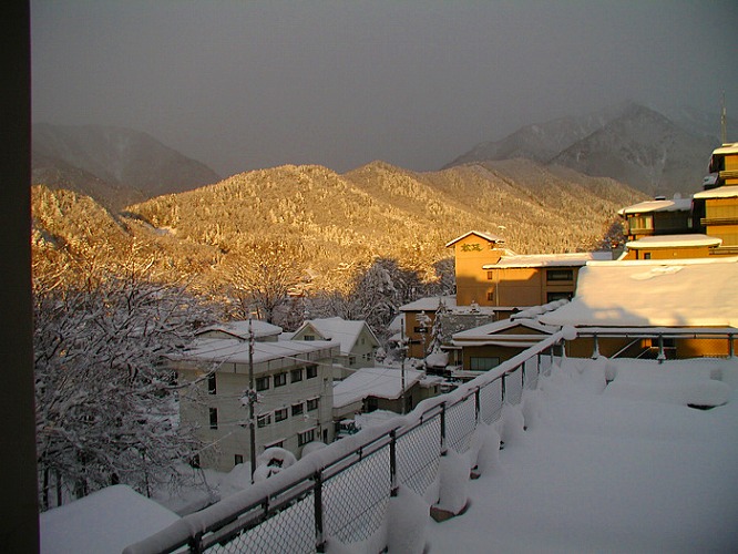 霞んだ中に木々の頭だけが黄金に輝き、右手山の一部分が金色に染まり始