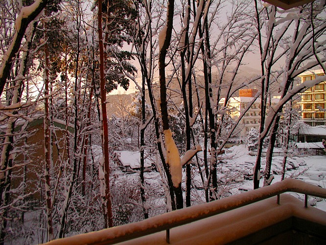 手前の木は下半分が白い雪、上の半分は金色、目前の山は黄金に輝き、奥の山は