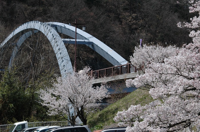 公園の入り口の近くに有るモダンな橋。 桜とマッチした風景である。