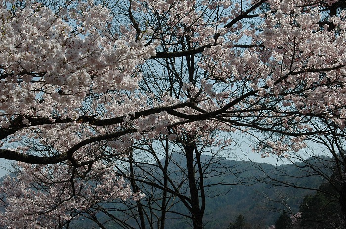 十字に交わる黒い枝、満開桜、遠くの山、 これは良きアングルだ!!