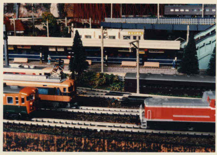 駅のプラットホームの風景である。A番線にはブルートレインが停車中、プラットホームには下車した人の姿が見える。 手前は操車場であるが、珍しく近鉄のビスタカーが停車中、デイーゼル機関車DD51も牽引準備中。