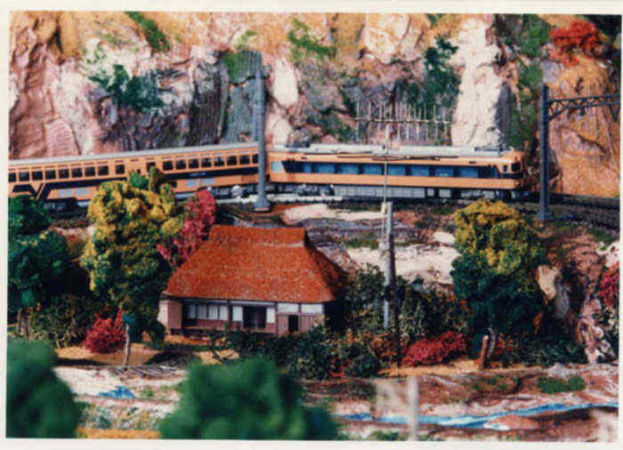 茅葺屋根の農家の裏を近鉄のビスタカーが走りぬける。農家の誰がアマチュア無線家だろうか?庭のパンザマストにはビームアンテナの7エレスタックが聳えている。 庭の紅葉も綺麗だ!