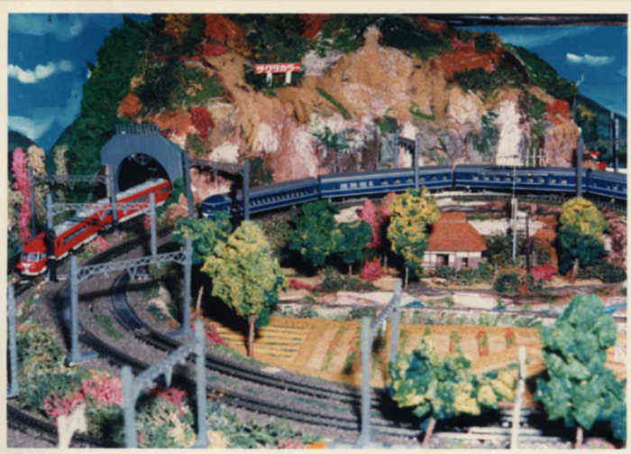 ブルートレイン 出雲 と名鉄パノラマ特急7000系とのすれ違い風景である。茅葺の農家、畑もよく見え、山の中腹のサクラカラーの看板もくっきりと見える。