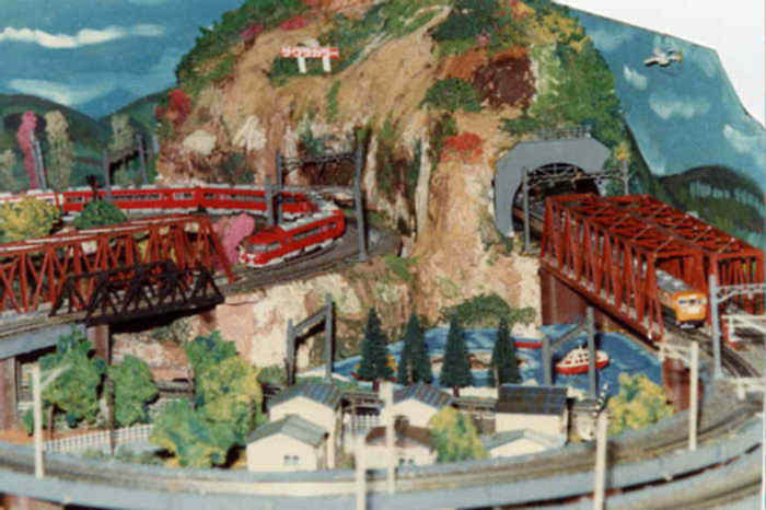 名鉄7000系パノラマ特急が右カーフの急勾配を登り、湘南型快速電車はトンネルを抜けゆっくり鉄橋を渡っている。 山の中腹には懐かしいサクラカラーの看板、そして入り江には水中翼船が入ってきた。右上空にはジャンボ機が着陸態勢に入っている。