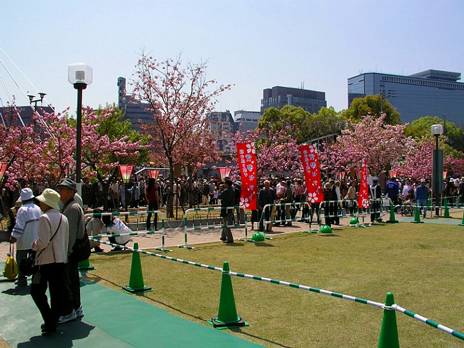 通り抜けの入り口付近:平日ながら、天気よし、見ごろよし、とあって すごい人ごみである。 毎年、約90万人が訪れると言われている。 通り抜け順路は南門から入り、北門付近までの約560メートルである。