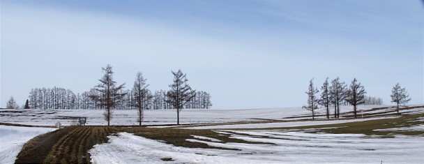 <マイルドセブンの丘> こんな景色を見たら、昨日のことなんかどうでもいい感じ・・。 雪残る丘とまだ冬枯れている哀愁