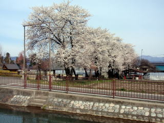 丁度、堰の奥で祭りをやってました。 となりの公園の桜も満開です。