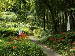 国道257号から少し脇道に入り、専用駐車場から200mくらい。 途中には彼岸花が綺麗に咲いていました。