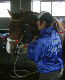 | ショートトラックでは結構首はうまく使うのですが、少し動きが硬い感じがします。ただ、ダート向きのピッチ走法なのかもしれません。 ダートコースの調教では、動きの硬さはあまり気になりませんでした。ハリ明けですがよい動きだったと思います。 騎乗者の方は「いつもは気の荒いところを見せるのだが今日はおとなしい」「トモにまだ力がついていない。本格化するのは秋ぐらい。無理に使って壊すよりはじっくり仕上げたほうがよい」と仰っていました。 ラフィアンのラヴ産駒は、結構仕上がりが早いという話ですが、シルクとは好対照で面白いです。兄(ダッシュ)は1勝し、姉(ヴィザージュ)にも出資していた関係でとても気になる1頭です。 こちらも、兄が勝ちあがっており、800万円はお買い得か。ラフィアンのラヴ産駒の6月デビューを見てからの決断になりそうです。 | ||