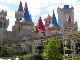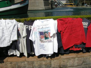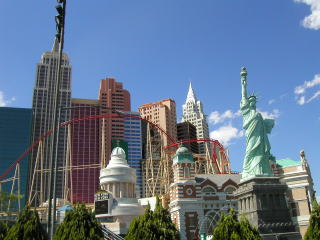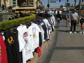両替し終わると早速ベガスの町をぶらつくことにした。ストリップをダウンタウン方面に歩くつもりだ。まずルクソールからモノレールに乗って隣のエクスカリバーにいった。さらにそこから歩いてニューヨークニューヨークへ行った。2年前に乗った世界で一番恐ろしいと思っているジェットコースターも健在だ。 ただ2年前と違うのはニューヨークニューヨークのホテルの柵の周りには多分、昨年9月11日に起きたテロ事件で亡くなった消防士への追悼と思われるTシャツが何枚もかけられていた。
