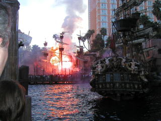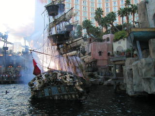フラミンゴをでると道路を渡り超ゴージャスホテルパレスなんかをタラタラみていた。だがここに来て本当に暑さが我慢できなくなってきた。周りをみてみるとみんなTシャツににショートパンツである。俺はというとジーパンにパーカー。今回は北周りで大陸横断する予定なのでかなり重装備できた。Tシャツもまともなやつは持ってきていない。温度表示をみると29℃!!さすがにアメリカ人じゃなくても暑いはずだ。 そこでフォーラムシップスというショッピングモールにはいってTシャツを買うことにした。どこでアメリカでは今どんなファッションが流行なのかなまわりの人の服装をよくみてみるとあることに気がついた。アメリカ人もしくは白人と黒人の男はほとんど荷物を持っていない。 ほとんどの人が手ぶらなのだ。逆に日本人を含めた東洋系の男は必ずタスキがけのカバンかリュックをで荷物を持っている。英語をしゃべっている東洋人も荷物を持っているということは多分東洋人のファッションセンスなのかもしれない。確かに日本では観光地じゃなくても若い子はファッションの一環としてカバンを持っている子がたくさんいる。だが今はこのタスキがけカバン又はリュックがたまらなくダサいものに思えてきた。 アメリカの若い子はもっと手ぶらなラフな感じがするのだ。俺自身タスキがけでカバンを持っているを持っているがなんかいやになってきた。だけどこれにはパスポート、航空券、アメリパスなどの貴重品が入っている。嫌だけどしょうがないけど持っていくしかない。逆に日本ではダサいと思っているベルトに携帯のケースをつけるやつ(よくおじさんがつけてるやつ)がアメリカの若い子でも結構つけてる子がいる。おかしな話これが結構かっこよく見えてきた。 少し脱線したけどなんとかフォーラムシップスで子供用MサイズのTシャツを16ドルで買った。サイズはぴったりだった。Tシャツをトイレで着替えて気分爽快になった後、俺がベガスの無料ショーで一番好きなトレジャーアイランドの海賊ショーを観にいった。 予定ではPM5:30から始まる予定がなぜか予定より1時間早くショーが始まった。なんかおかしいとは思ったが日曜だからなのかなと思い直した。しかしこの時サマータイムのことに気がつくべきだった。この時は全く気がつかなかった為速く始まってラッキーと思って見ていた。